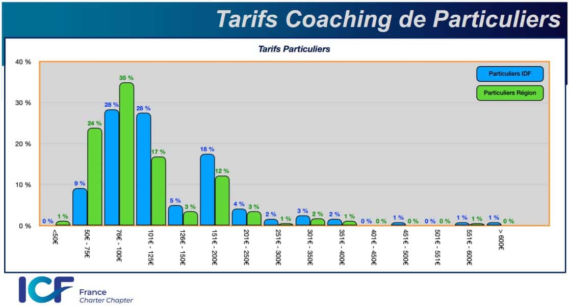 Le prix d’une séance de coaching professionnel dépend de ses certifications et de son expérience. Voici les tarifs en vigueur en moyenne pour les particuliers en Ile de France et en Région, selon l’étude réalisée en 2021 par l’International Coaching Federation France (ICF).