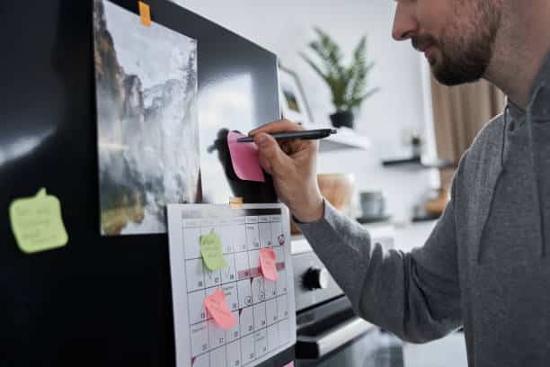 un homme qui écrit une note sur le frigo
